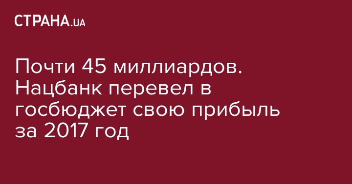 Национальный банк Украины (НБУ) полностью перевел в государственный бюджет свою прибыль, полученную в 2017 году. Объем средств составил 44,6 миллиардов гривен. Об этом говорится в сообщении пресс-службы НБУ.