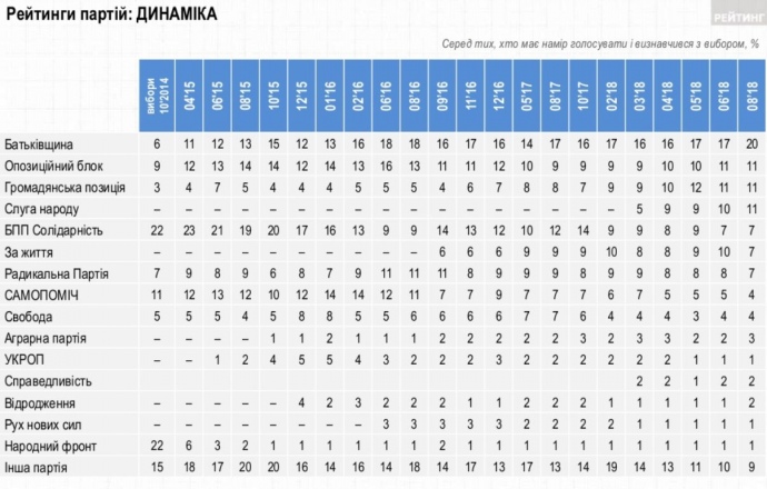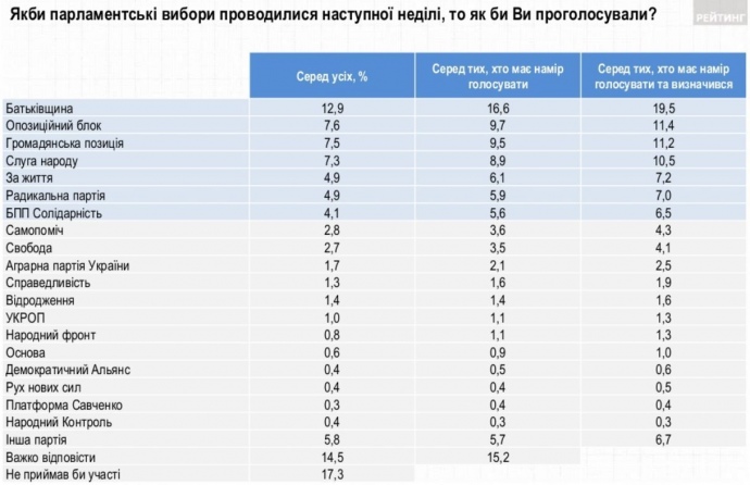 Партийный рейтинг возглавляет "Батькивщина", которую готовы поддержать 19,5% тех, кто планирует голосовать и определился с выбором. На второй позиции "Оппозиционный блок". "Гражданская позиция" Анатолия Гриценко и гипотетическая партия "Слуга народа" Владимира Зеленого на третьем и четвертом местах.