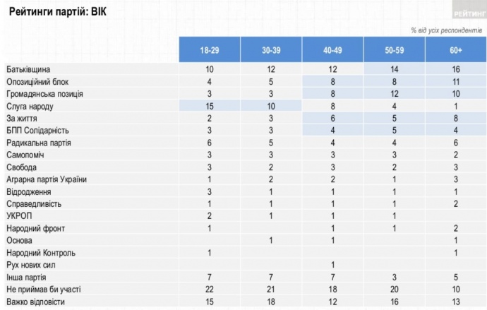 При этом "Батькивщину", "Оппозиционный блок", "Гражданскую позицию", партию "За життя" и "БПП Солидарность" больше поддерживают респонденты среднего и старшего возраста. За партию "Слуга народа" больше готова голосовать молодежь.