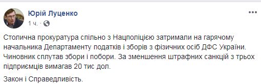 "Чиновник спутал сборы и поборы. За уменьшение штрафных санкций с трех предпринимателей требовал $20 тысяч", - написал Луценко. Генпрокурор также опубликовал фотографию, предположительно, сделанную во время задержания чиновника ГФС.