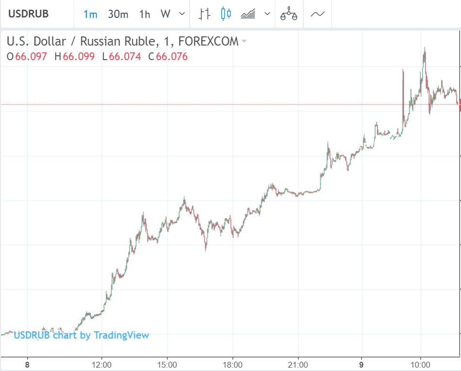 На фоне новостей о новом санкционном пакете рубль упал до уровня ноября 2016 года и превысил 66 рублей за доллар.