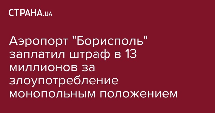Международный аэропорт "Борисполь" уплатил штраф в размере 12,7 млн грн за злоупотребление монопольным положением на рынке специализированных услуг аэропортов. Об этом написал председатель Антимонопольного комитета Юрий Терентьев в Facebook.