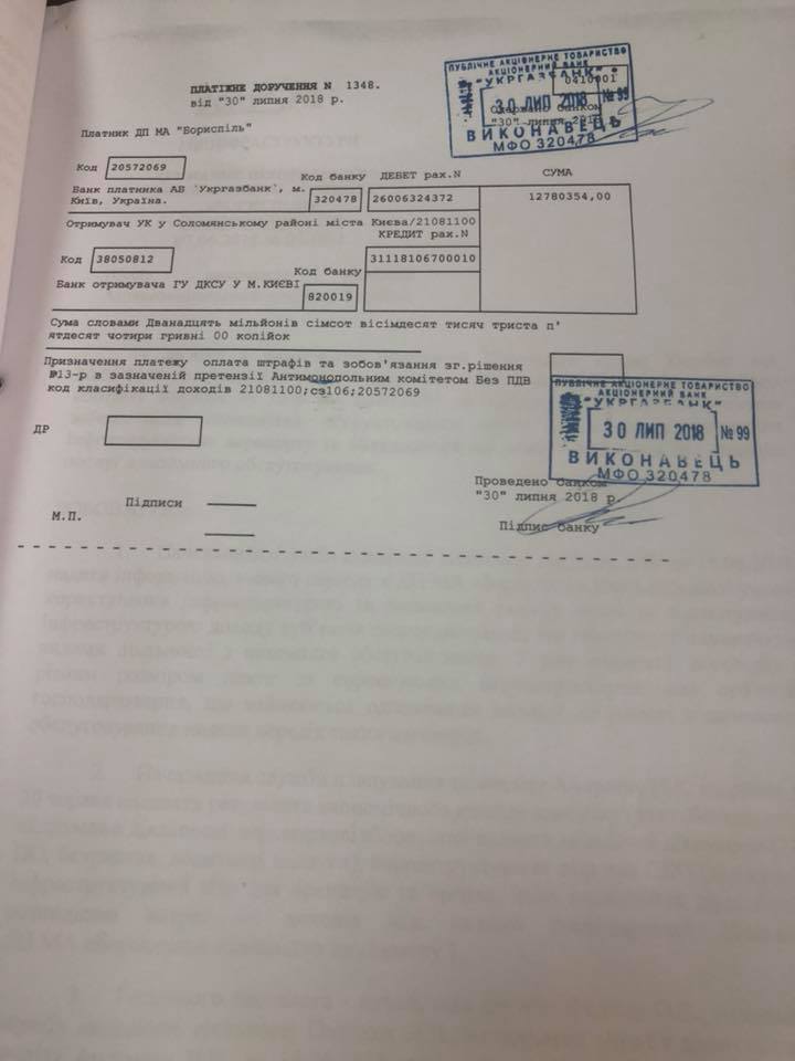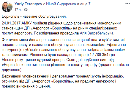 "Больше года длился судебный процесс. Сегодня пришло письмо от "Борисполя" о выполнении решения и уплате штрафа (приложено платежное поручение). Государственный уполномоченный и департамент проанализируют информацию, полученную от ГП "Аэропорт "Борисполь", на предмет надлежащего и полного исполнения решения", - говорится в сообщении.