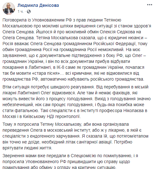 "Впрочем, ситуация требует быстрого реагирования. От пребывания в городской больнице Лабытнанги Олег отказался. Но там нет специалистов, которые могут вывести его из процесса голодания. Выход из голодания значительно опаснее, чем сам процесс голодания, и любая погрешность может стать роковой. Такие специалисты есть в Институте профессора Николаева в Москве и в Киевском НИИ геронтологии. Поэтому я попросила Татьяну Москалькову, чтобы она организовала перевод Олега в московский институт, или же в больницу, в которой есть специалисты по эндогенному питанию. Я сказала ей, что поездом/этапом он точно не доедет, необходим самолет санитарной авиации. Нужно спасти человеку жизнь", - заявила украинский омбудсмен.