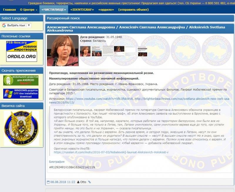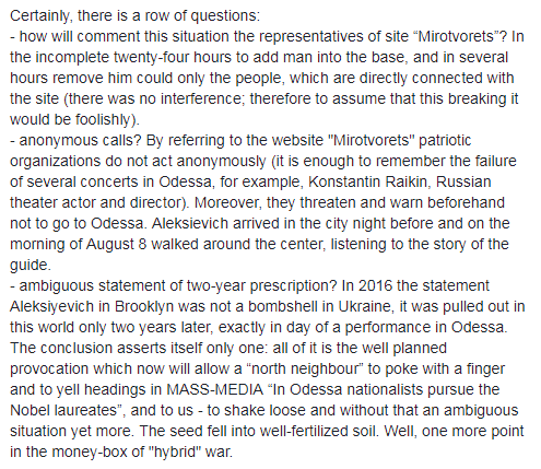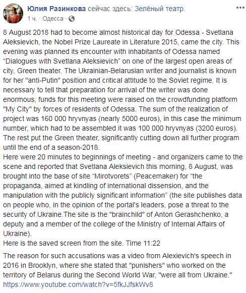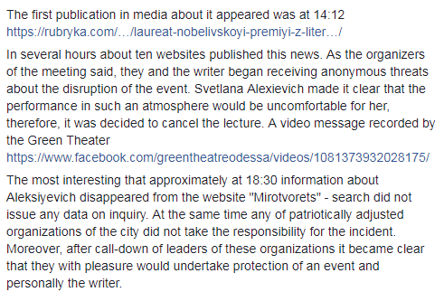 "Обращаясь к веб-сайту "Миротворец", патриотические организации не действовали анонимно. (Достаточно вспомнить срыв концертов российского режиссера Константина Райкина) Более того, они угрожали и заранее предупреждали (Алексеевич - Прим.Ред.) не ехать в Одессу. Алексиевич прибыла в город накануне, а утром 8 августа ходила по центру, слушая рассказ гида", - сообщила она.