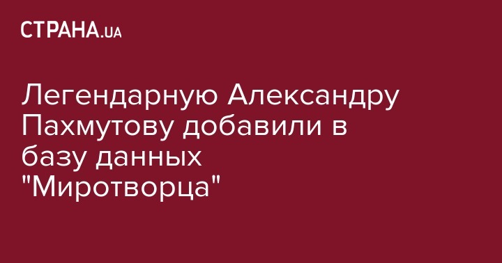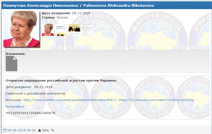 Администрация сайта "Миротворец" добавила в свою базу данных 88-летнюю советского и российского композитора Александру Пахмутову за "открытое оправдание российской агрессии против Украины". Такая запись появилась там в четверг, 9 августа.