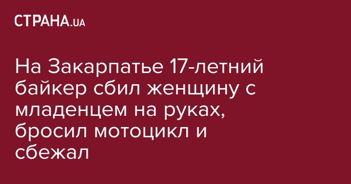 На Закарпатье в Рахове 17-летний мотоциклист сбил мать с двухнедельным младенцем и скрылся с места инцидента. Об этом сообщает пресс-служба Нацполиции региона.