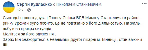 Глава союза бойцов Воздушно-десантных войск Украины Николай Станкевич госпитализирован в реанимацию больницы №2 г. Винницы в тяжелом состоянии. У него травма головы, ночью был без сознания. Об этом сообщил нардеп от БПП Сергей Кудлаенко.