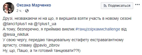 Оксана Марченко сообщила, что теперь передает челендж певцу Павлу Зиброву. Таким образом, он может стать еще одним участником шоу.