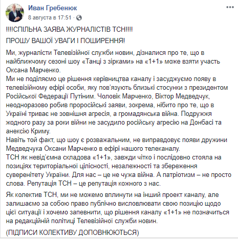 "Мы, журналисты Телевизионной службы новостей, узнали о том, что в ближайшем сезоне шоу "Танцы со звездами" на 1 +1 может принять участие Оксана Марченко. Мы не разделяем это решение руководства канала и осуждаем появление в телевизионном эфире лица, которое связывают близкие отношения с президентом Российской Федерации Путиным. Муж Марченко, Виктор Медведчук, неоднократно делал пророссийские заявления, в частности, якобы о том, что в Украине идет не внешняя агрессия, а гражданская война. Супруги ни разу за годы войны не осудили российскую агрессию в Донбассе и аннексию Крыма. Даже тот факт, что шоу является развлекательным, не оправдывает появления жены Медведчука Оксаны Марченко в эфире нашего телеканала", - говорится в заявлении.