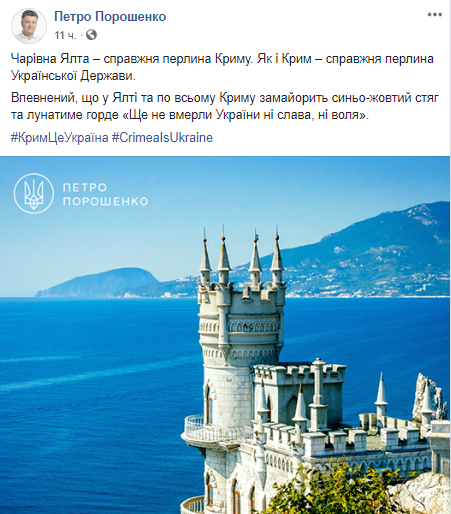 "Волшебная Ялта - настоящая жемчужина Крыма. Как и Крым - настоящая жемчужина Украинского Государства. Уверен, что в Ялте и по всему Крыму поднят сине-желтый флаг и будет звучать гордое "Ще не вмерли України ні слава, ні воля", - говорится в сообщении от имени президента.