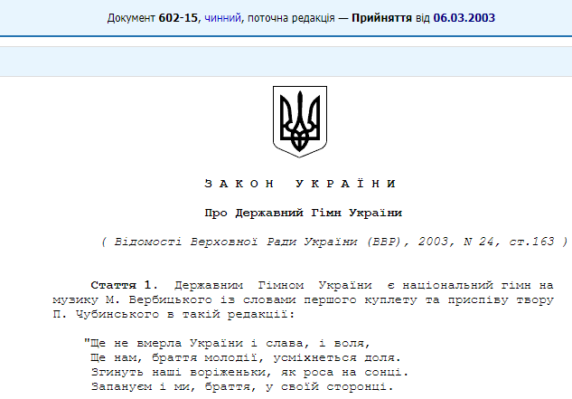 При этом цитата "Ще не вмерли України ні слава, ні воля" ошибочная. Официальный текст гимна, утвержденный 6 марта 2003 года звучит так: "Ще не вмерла України і слава, і воля". Это закреплено в законе "О государственном гимне".