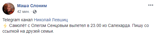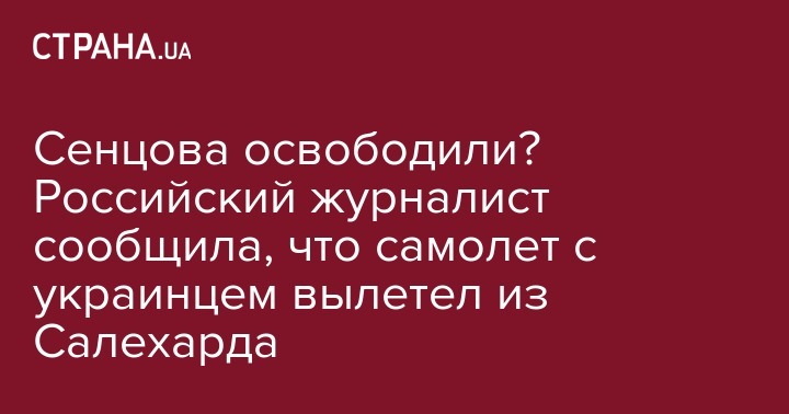 Российский журналист Виктория Ивлева сообщила, что самолет с украинским режиссером Олегом Сенцовым, заключенным в России, вылетел из Салехарда.