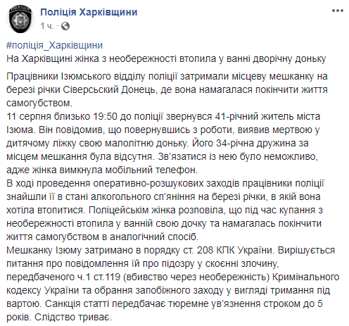 11 августа жительница Изюмского района Харьковской области по неосторожности утопила свою двухлетнюю дочь в ванной. Об этом сообщает полиция Харьковской области на странице в Facebook.