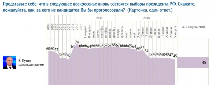 На вопрос "Вы доверяете или не доверяете В. Путину?" вариант ответа "безусловно доверяю" в августе выбрало только 24% опрошенных, тогда как в марте этого года таких было 43%.
