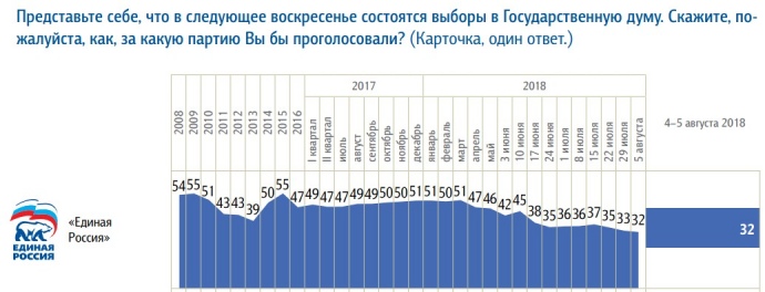 Рейтинг партии "Единая Россия" упал до 32%. В январе 2018 года он составлял 51%, а в 2015 году – 55%.