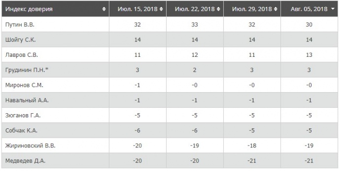 Индекс доверия к Путину (разница между положительными и отрицательными оценками) в августе составляет 30, в июле составляла 32-33.