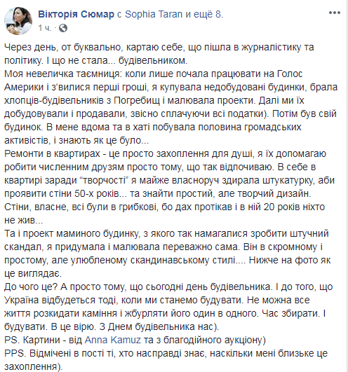 По словам экс-журналистки, когда она только начала работать на "Голосе Америки" и "появились первые деньги", то стала скупать недостроенные дома. Она нанимала "ребят-строителей с Погребищ" и самостоятельно рисовала проекты реконструкции или достройки зданий.