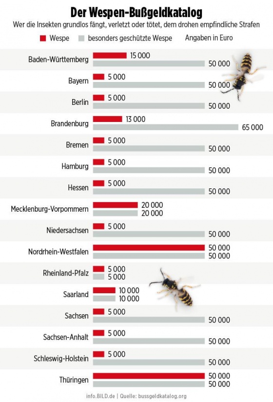 В ФРГ убийство осы влечет за собой в разных землях от 5 тыс. до 50 тыс. евро. Об этом пишет Bild.