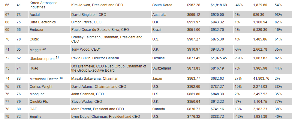 В тройке лидеров ТОП-100 мировых производителей вооружений Defense News по итогам 2017 года, как и в прошлогоднем рейтинге, ведущие американские и западно-европейские производители: первое место у Lockheed Martin (США) – с $47,985 млрд (+10%), второе – у Raytheon Company (США) c $23,573 млрд (+5%), третье - у ВAE Systems (Великобритания) с $22,38 млрд (-5%).