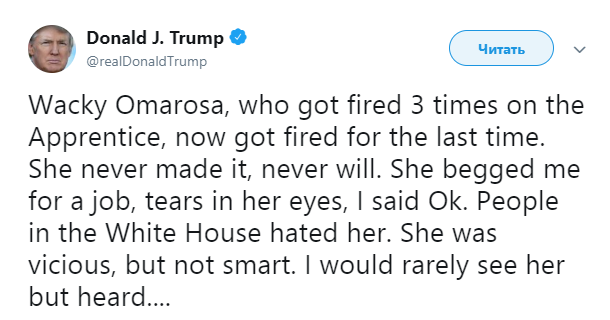Соответствующее сообщение Трамп в понедельник разместил на своей странице в Twitter. "Чокнутая Омароса, которую трижды увольняли с реалити-шоу "Ученик" (Apprentice), теперь уволена в последний раз. У нее никогда не получалось и никогда не получится. Она умоляла меня со слезами на глазах взять ее на работу. Я согласился, - отметил Трамп. - Сотрудники Белого дома ее ненавидели. Она была злобной, но не умной".