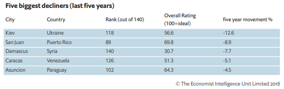 The Economist также составил рейтинг городов, которые за 5 лет больше всего ухудшили или улучшили свое положение в списке.