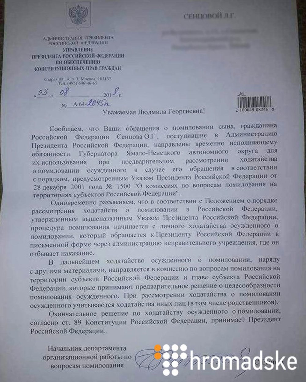 "Вместе с тем объясняем, что в соответствии с Положением о порядке рассмотрения ходатайств о помиловании в Российской Федерации... процедура помилования начинается с личного ходатайства осужденного о помиловании, в которой он обращается к президенту РФ в письменной форме через администрацию исправительного учреждения, где он отбывает наказание", - говорится в ответе администрации президента России к матери Сенцова.