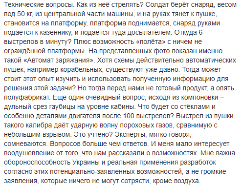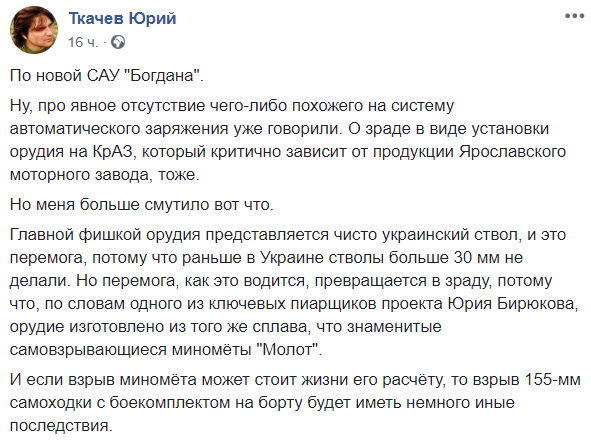 "Главной фишкой орудия представляется чисто украинский ствол, и это перемога, потому что раньше в Украине стволы больше 30 мм не делали. Но перемога, как это водится, превращается в зраду, потому что, по словам одного из ключевых пиарщиков проекта Юрия Бирюкова, орудие изготовлено из того же сплава, что знаменитые самовзрывающиеся миномёты "Молот".
