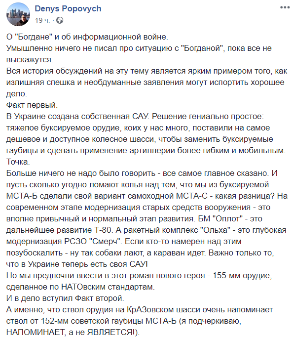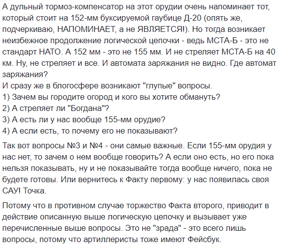 Так вот вопросы №3 и №4 - они самые важные. Если 155-мм орудия у нас нет, то зачем о нем вообще говорить? А если оно есть, но его пока нельзя показывать, ну и не показывайте тогда вообще ничего, пока не будете готовы", - пишет Попович.