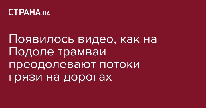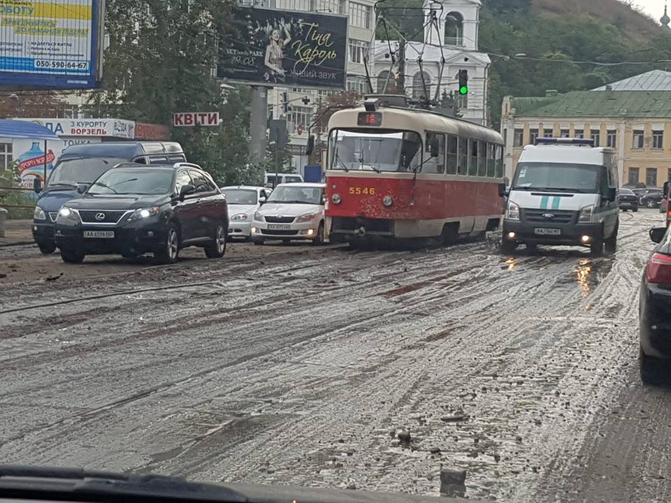 Появилось видео, как на Подоле трамваи преодолевают потоки грязи на дорогах