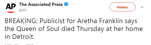 В США в возрасте 76 лет умерла певица Арета Франклин. Ее называли королевой соула. Она стала первой женщиной, чье имя было занесено в Зал славы рок-н-ролла. Журнал Rolling Stone объявил ее величайшей певицей в истории. Арета Франклин была удостоена 18 наград Grammy.