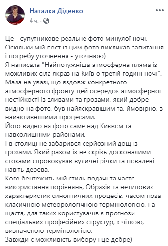 "Я имела в виду, что вдоль конкретного атмосферного фронта этот очаг атмосферной неустойчивости с ливнями и грозами, который хорошо видно на фото, был самым ярким и, вероятно, с активными процессами. Его видно на фото именно над Киевом и окружающими районами. И в столице не заставил себя ждать серьезный дождь с грозами. Который вместе с не везде совершенными стоками спровоцировал уличные реки и поваленные даже деревья", - написала она.