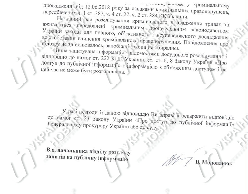 "Другая запрашиваемая информация (о том, есть ли в действиях Холодницкого признаки преступления - Прим.ред.) является сведениями досудебного расследования и согласно ст 222 УПК... является информацией с ограниченным доступом и не может быть на это время обнародована", - отмечается в запросе.