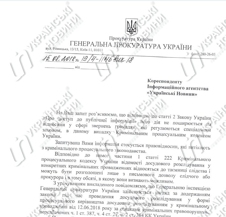 Об этом говорится в ответе Генпрокуратуры на запрос Украинских Новостей.