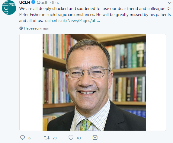 "Мы все глубоко шокированы и расстроены, узнав, что доктор Питер Фишер трагически погиб в ДТП вчера. Питер был директором по исследованиям Королевской Лондонской больницы комплексной медицины (RLHIM) Лондонского университета UCLH и личным врачом ее Величества Королевы", - заявил директор Университетского колледжа лондонских больниц, доктор Джилл Гаскин.