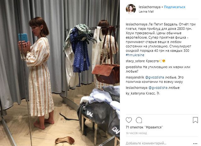 Посетители выбирали вещи и фотографировались с шампанским. "Цены обычные европейские. Супер приятная фишка - принимают старые вещи в любом состоянии на утилизацию. Стимулируют скидкой порядка 40 грн на каждых 300", - делились они впечатлениями.