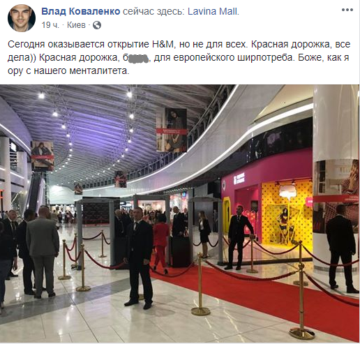 "Сегодня оказывается открытие H&M, но не для всех. Красная дорожка, все дела. Красная дорожка, бл@, для европейского ширпотреба. Боже, как я ору с нашего менталитета" - написал пользователь Влад Коваленко.