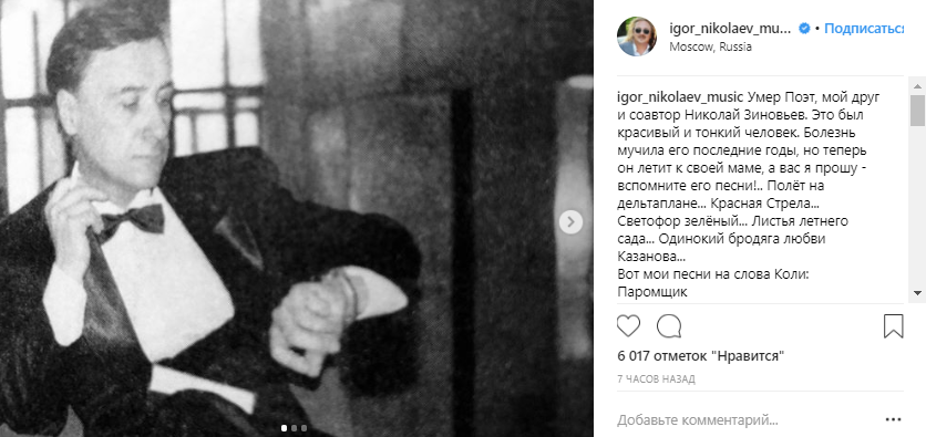 "Умер Поэт, мой друг и соавтор Николай Зиновьев. Это был красивый и тонкий человек. Болезнь мучила его последние годы, но теперь он летит к своей маме, а вас я прошу – вспомните его песни!.. Полет на дельтаплане... Красная Стрела... Светофор зелёный... Листья летнего сада... Одинокий бродяга любви Казанова...Вот мои песни на слова Коли: "Паромщик", "Афганский ветер", "Мастер и Маргарита", "Конечно, есть ещё песни, по каким-то причинам не записанные или не вышедшие. Я тебе обещаю, Коля, они выйдут! Ты услышишь. Все услышат. Царствия небесного", – написал Николаев.