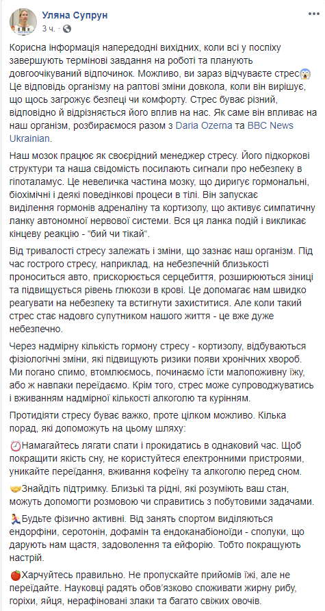 Глава Минздрава Ульяна Супрун сообщила, что чрезмерное количество гормона стресса повышает риск появления хронических болезней. А поддержка близких, сон, регулярные физические нагрузки и правильное питание помогут справится с неприятными последствиями стресса. Об этом Ульяна Супрун написала на странице в Facebook.
