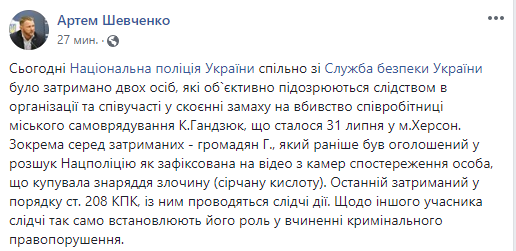 "Сегодня Национальная полиция Украины совместно со Службой безопасности Украины задержала двоих лиц, которые объективно подозреваются следствием в организации и соучастии в совершении покушения на убийство сотрудницы городского самоуправления Гандзюк, которое произошло 31 июля в г.Херсон", - написал Шевченко на своей странице в соцсети Facebook в пятницу.