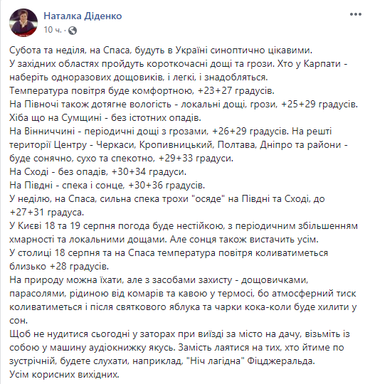 Наталья Диденко прогнозирует периодические дожди с грозами и температуру +26 +29 градусов в Винницкой области. В остальных центральных регионах - Черкассах, Кропивницком, Полтаве, Днепр и районах будет солнечно, сухо и жарко, + 29... + 33 градуса. На востоке - без осадков, + 30 + 34 градуса. На юге - жара и солнце, + 30... + 36 градусов. В воскресенье, на Спас, жара в южных и восточных регионах немного спадет - до + 27... + 31 градуса.
