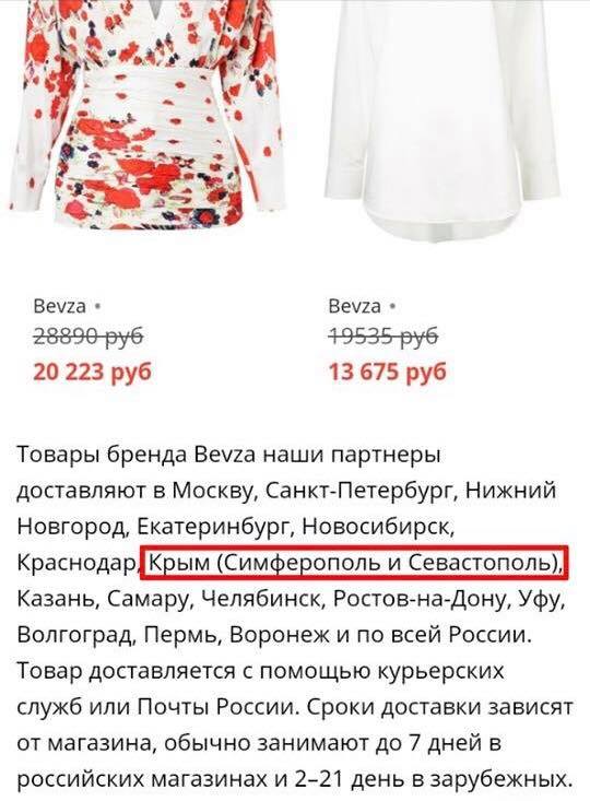 Журналист Александр Дубинский позвонил в интернет-магазин Farfetch, с которым у жены министра инфраструктуры Украины Владимира Омеляна Светланы Бевзы заключен контракт. Там ему подтвердили, что российский магазин доставляет ее одежду как в Россию, так и на территорию оккупированного Крыма. Об этом он написал на своей странице в Facebook.