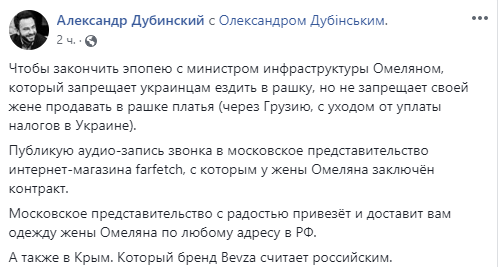 "Чтобы закончить эпопею с министром инфраструктуры Омеляном, который запрещает украинцам ездить в Рашку, но не запрещает своей жене продавать в Рашке платья (через Грузию, с уходом от уплаты налогов в Украине). Публикую аудио-запись звонка в московское представительство интернет-магазина farfetch, с которым у жены Омеляна заключён контракт. Московское представительство с радостью привезёт и доставит вам одежду жены Омеляна по любому адресу в РФ. А также в Крым. Который бренд Bevza считает российским", - написал журналист.