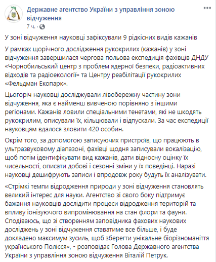 Согласно сообщению, уже завершилась полевая экспедиция в рамках ежегодного исследования рукокрылых. В этом году ученые исследовали левобережную часть зоны отчуждения, которая является наименее изученной по сравнению с другими регионами.