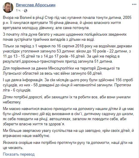 Только летом 2018 года в Украине с собой покончило 6 детей. Об этом на своей странице в Facebook написал первый заместитель председателя Национальной полиции Украины Вячеслав Аброськин.