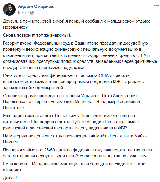 Еще один важный аспект. Поскольку у Порошенко имеется вид на жительство в Швейцарии (кантон Цуг), а господин Плахотнюк имеет румынский и российский паспорта, к делу подключили и ФБР.