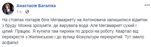 "На столбах фонарей у Мегамаркета на Антоновича остались отметки из грязи. Можно понять, где бурлила вода. Но Мегамаркет сухой и целый. Работает. Я купила там пирожки по дороге на работу. Квартал от перекрестка с Жилянской и до улицы Физкультуры перекрыт. Здесь смыло асфальт", - рассказала Багалика.