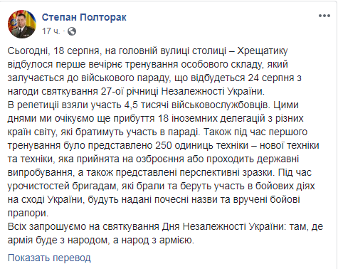 Кроме 4,5 тысяч украинских военных и 250 единиц военной техники, в параде ко Дню Независимости в Киеве поучаствуют члены 18 делегаций из разных стран мира. Об этом на своей странице в Facebook сообщил министр обороны Степан Полторак.