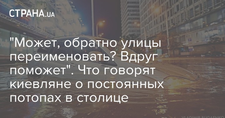 На уточнение "Страны" о том, что потопы после дождя в Киеве происходят не впервые, – еще несколько дней назад на дорогах была аналогичная ситуация, хотя и дожди были не такие сильные и продолжительные, – заммэра ответил: "Сегодня – аномальная погода и аномальное количество осадков. Несмотря на то, что Гидрометцентр говорит, что это вполне нормальная погода для летнего сезона, но, по-моему, это абсолютно ненормально, и ливнестоки не справляются. Дождь мы, к сожалению, не можем контролировать".
