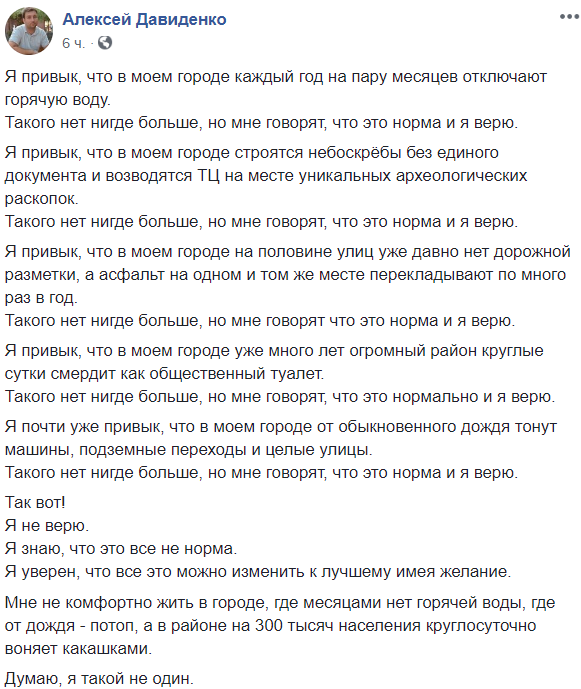 "Я привык, что в моем городе каждый год на пару месяцев отключают горячую воду. Такого нет нигде больше, но мне говорят, что это норма, и я верю.